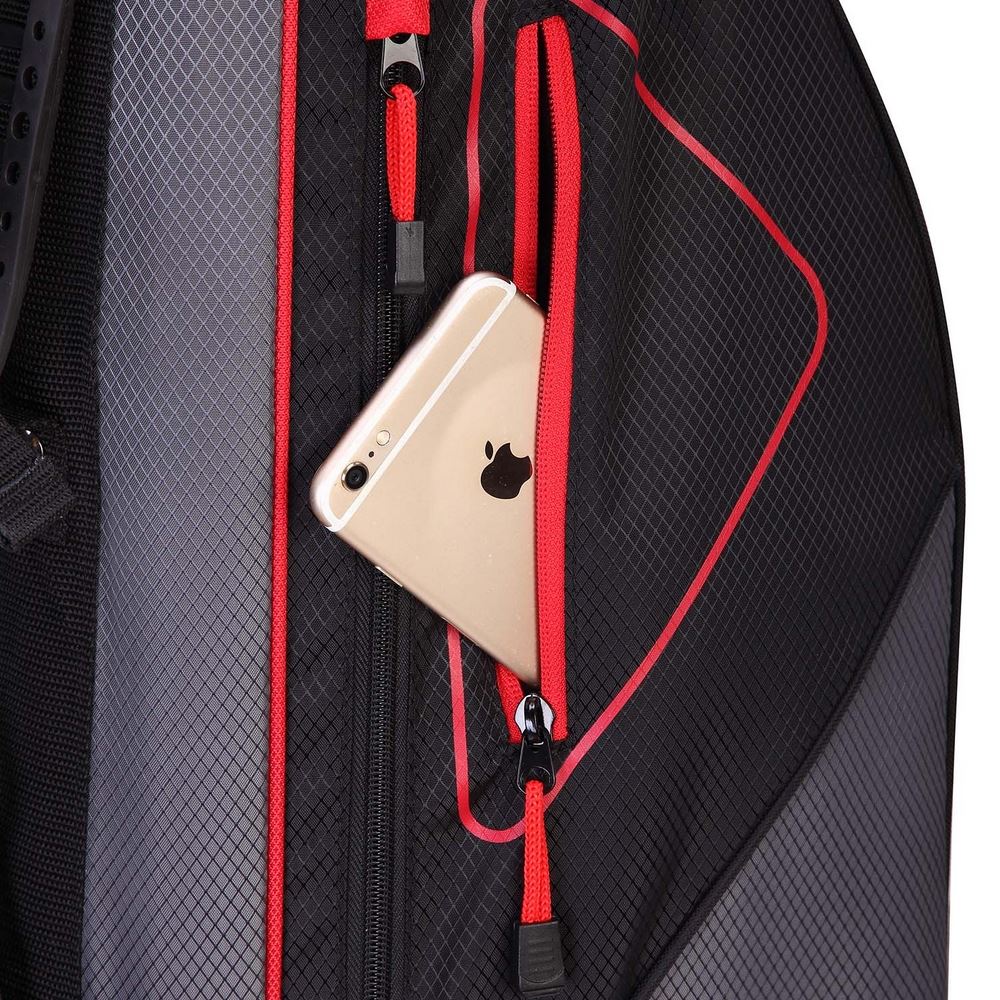 Full-length apparel pocket. Insulated bottle pouch. Front ball pocket, soft lined valuables pocket, plus additional side pocket. All designed with a specific need in mind, to let you focus on your round, not on finding your stuff.